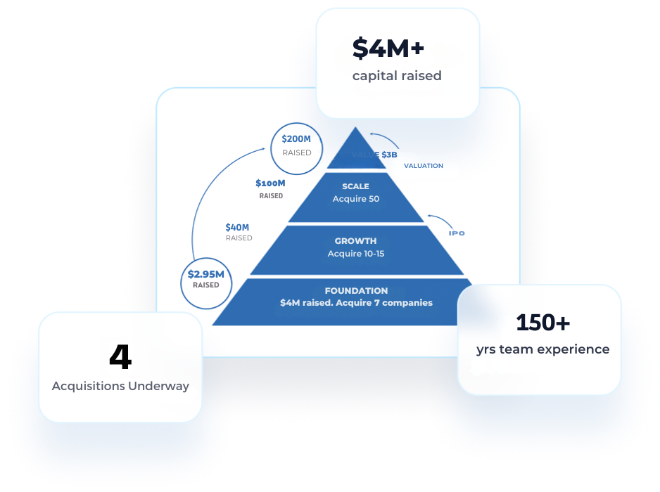 Led by operators with $500M+ in past exits and 50+ acquisitions closed. We intend to acquire generating, under-optimized AI companies and plug them into our shared growth infrastructure. The light red shows existing ARR, the dark red is management's projected new growth after integration. Backed by a team with $500M+ in exits and 50+ acquisitions, we’re positioned to execute this M&A strategy and hit our goal of $3M ARR by early 2026.